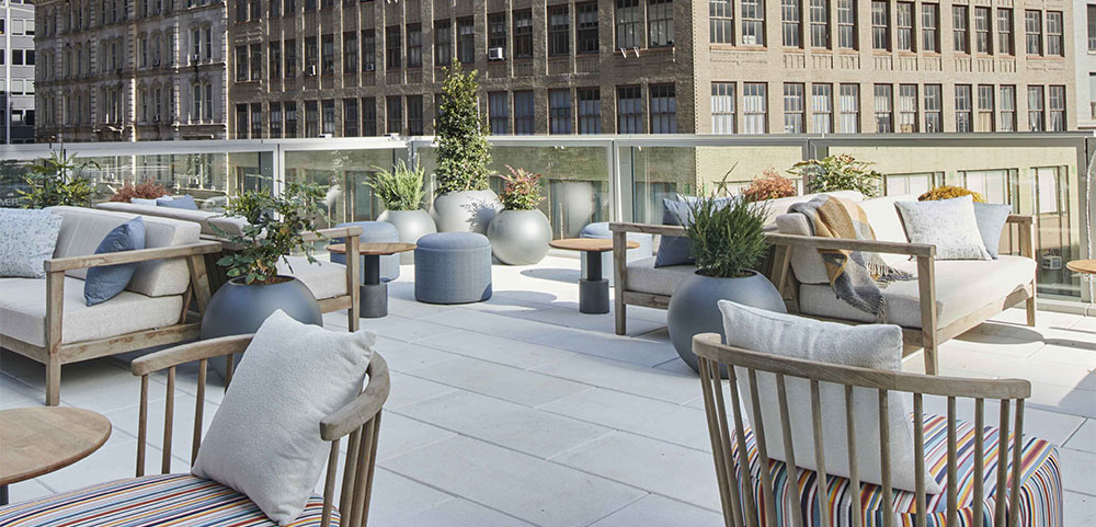 Virgin Hotels New York的三楼是多功能餐饮空间 Everdene,而酒店顶层设有泳池俱乐部(Pool Club),这片顶层绿洲成为客人们一边享用清爽的池畔饮品,一边欣赏纽约城市景色的好地方。